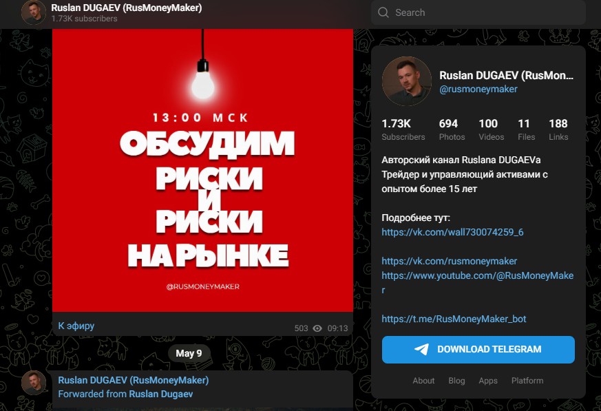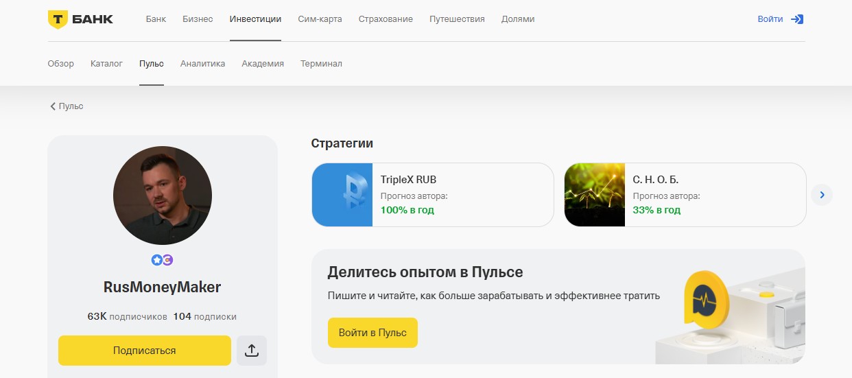 Дугаев активно делится своим мнением и аналитикой на платформе «Пульс» от Тинькофф Инвестиций, где создан профиль, как и в ТГ, – Ruslan DUGAEV RusMoneyMaker. Там автор даже участвует в разных эфирах и обсуждает актуальные темы рынка: облигации, инфляция, извечные страх и жадность на рынке фиксированной доходности. Вроде бы, все как у серьезных людей.