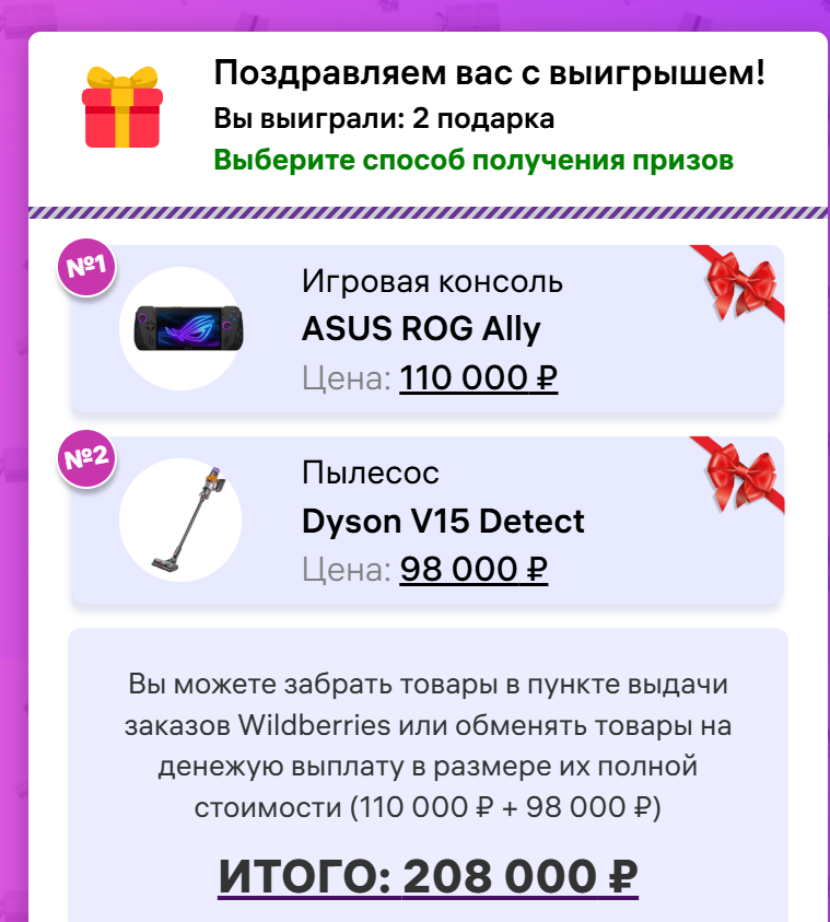 В сообщениях есть только ссылки на сайт Tvoy-WildBerries PulseCraft site, где дают три попытки, но можно выиграть дополнительные, а во время проверки нам написали, что мы выиграли консоль Asus стоимостью ₽110,000 и пылесос Dyson за ₽98,000.