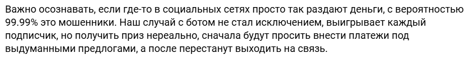 Мы проверили бота и выяснили, что владельцы не предоставляют доказательств реальных выплат, используют домен третьего уровня с подозрительным адресом, требуют предоплату за призы, а также позиционируют свой проект как лотерею от известных маркетплейсов без каких-либо подтверждений.