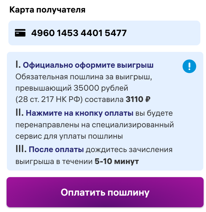 Чтобы получить приз, нужно ввести номер банковской карты, после чего опять появляется очередь, но потом владельцы бота «Твой Подарок рф» просят оплатить пошлину в размере ₽3,110.