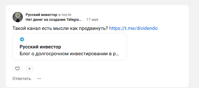 Проект хоть и не накачан ботами, но он очень слаб в плане аудитории (мало подписчиков) и контента (много воды и мало фактов). Да, канал реально авторский и перед нами реально мысли человека, занимающегося инвестициями. Но если он получает пассивные доходы от российских компаний, почему не может вложить деньги в рекламу своего канала и спрашивает на других площадках, как его продвинуть?