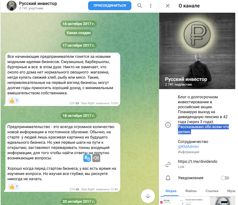 Русский инвестор — блог в Телеграме о долгосрочном инвестировании в российские акции. Администратор пишет, что планирует выйти на дивидендную пенсию в 42 года (через 3 года). Он ведет своеобразный Телеграм-дневник, в котором рассказывает обо всем, что делает.