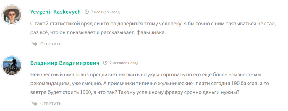 В интернете о Рустаме А встречается много негативных комментариев. Подписчики сообщества полагают, что он не внушает доверия. Все сведения недостоверные, а прогнозы лживые. Пользователи сталкиваются исключительно с денежными убытками.