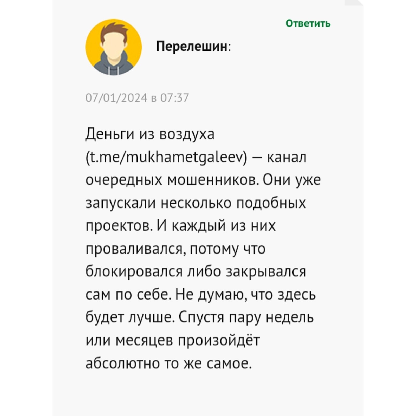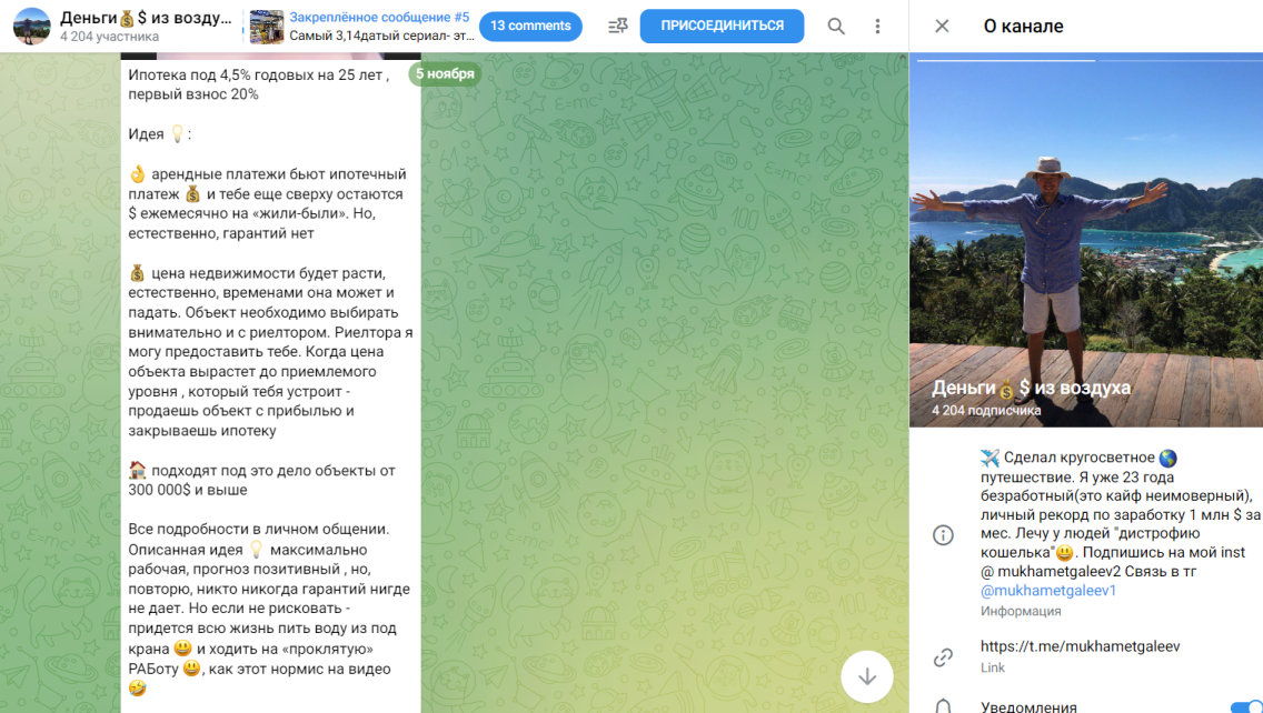 В Телеграмме админ Mukhametgaleev8 запрещает оставлять комментарии. На тематических площадках мы нашли негативные высказывания от пользователей. В них пишут, что предложения по заработку, которые продвигает Рустам Мухаметгалеев — развод.
