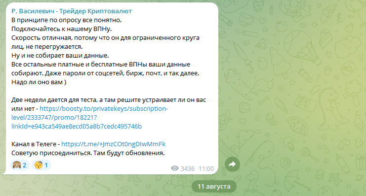 Впоследствии в ленте начинает появляться настырная реклама платных услуг по предоставлению сигналов и бесплатного ВПН. Последнее выглядит особенно тревожно, т. к. софт новый, и это не продукт от какого-то известного разработчика, а в точности наоборот. Проблема в том, что такое ПО таит риски кражи личных данных. Поэтому VPN желательно устанавливать с проверенных сайтов надежных компаний, а не экономить деньги, покупая настолько важный софт в сомнительных телеграмм-каналах.