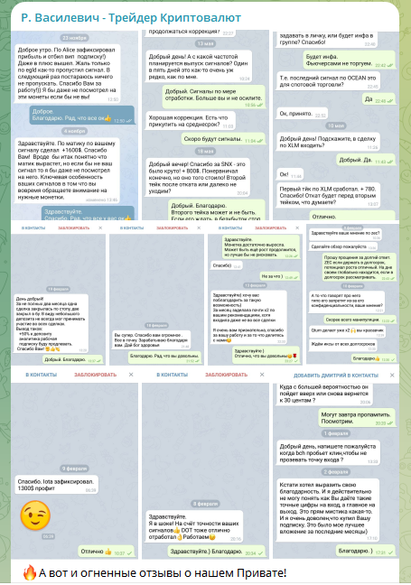 Мы не рекомендуем связываться с «Р Василевич – Трейдер Криптовалют» и другими каналами этого админа. Но, возможно, вы имели опыт сотрудничества с ними? Тогда, пожалуйста, расскажите общественности, удалось ли заработать? Ну а чтобы всегда знать, с кем стоит иметь дело, а кого лучше обходить стороной, читайте наши обзоры и используйте отзывы, чтобы уточнить информацию по любому заинтересовавшему вас проекту или трейдеру.