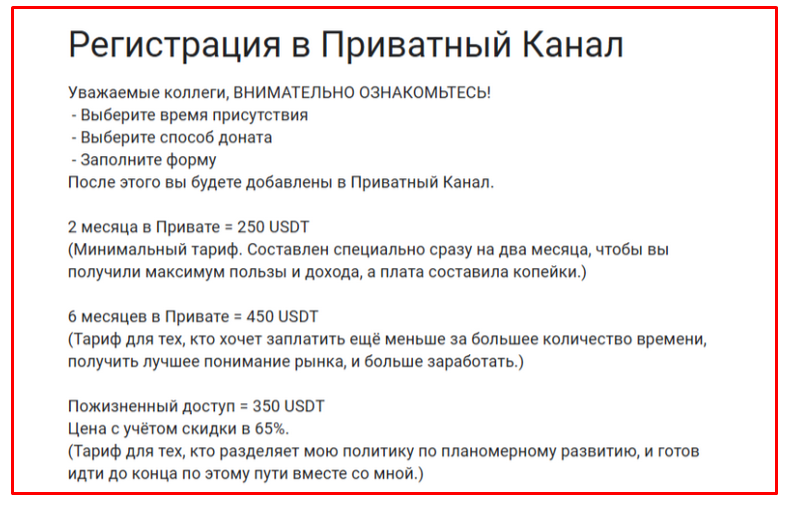 - Возможности протестировать эффективность инвестиционных решений автора, оплатив доступ на месяц, нет. Начальный тариф предполагает покупку двух месяцев за $250.