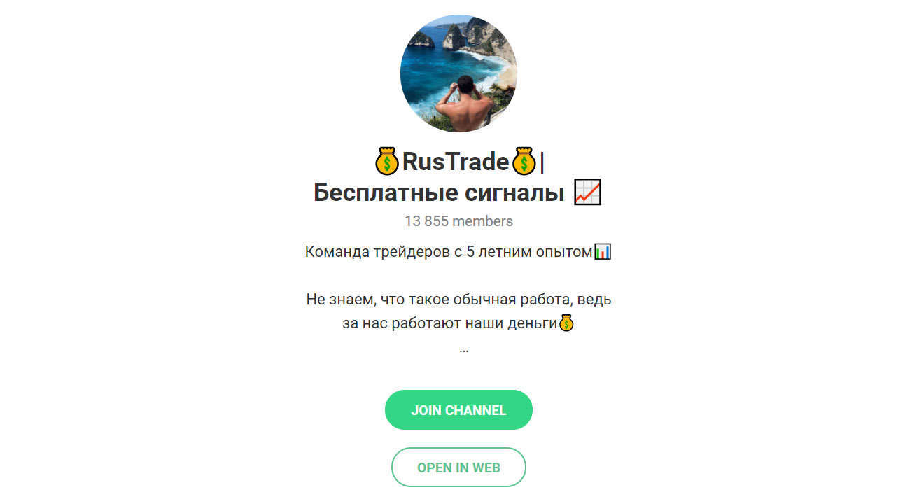 В одной из статей был скриншот телеграм-канала RusTrade без актуальной на него ссылки. В описании блога указывается, что его ведет команда опытных трейдеров с 5-ти летним стажем работы. На аватарке стоит фото мужчины спиной, поэтому непонятно, кому оно принадлежит. Демонстрировать свое лицо автор не захотел.