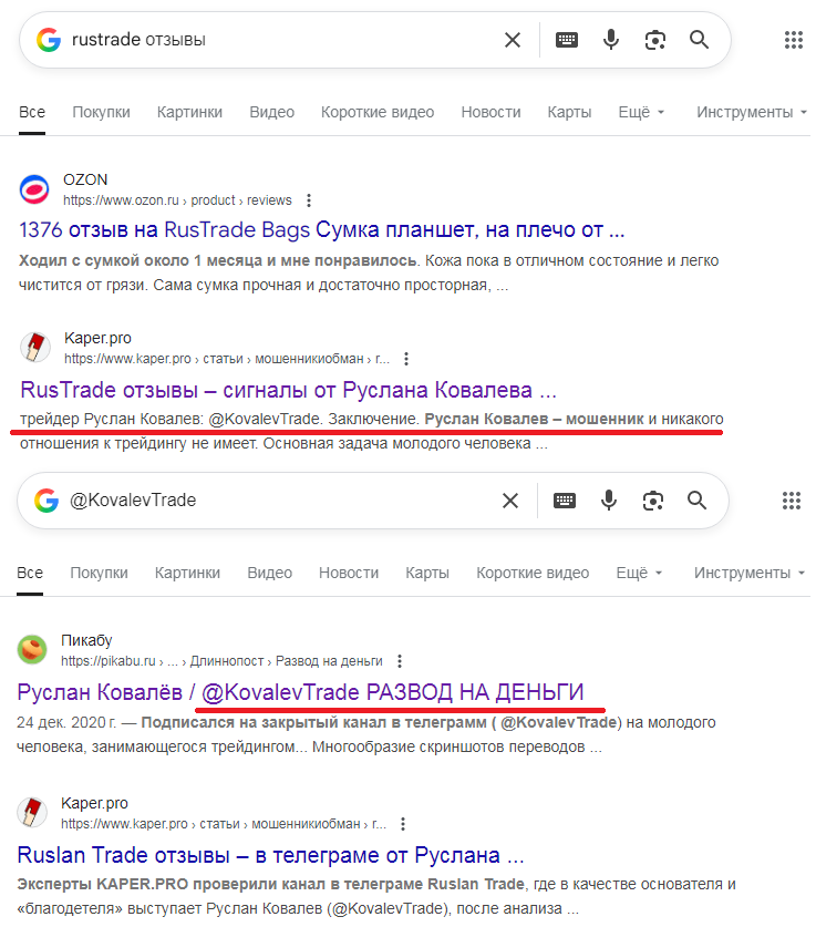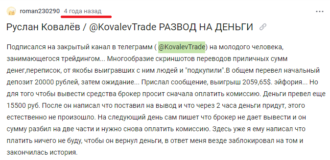 В интернете о данном ресурсе почти нет никакой информации. Это говорит о том, что паблик точно не является известным и востребованным. Отзывов от аудитории блога RusTrade не видно, но в одной статье идет речь о том, что создатель Руслан Ковалев – мошенник.