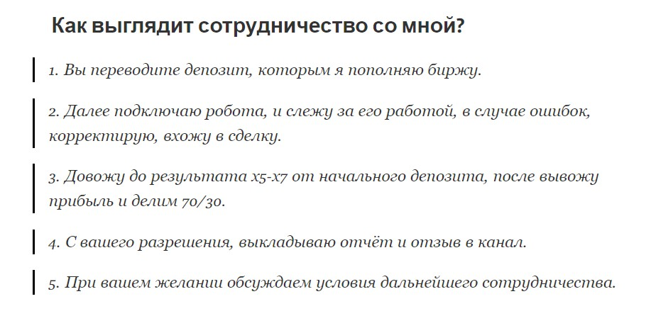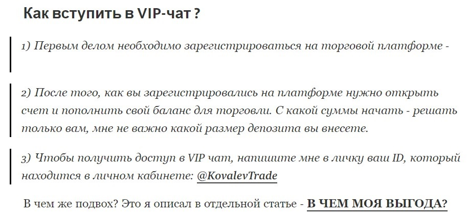 После этого он вступает в сделку, доводит ее до максимально высокой суммы и выводит заработок. С этой прибыли блогер забирает себе 30%. Для дальнейшего сотрудничества автор советует вступить в его VIP-чат. Стоимость входа не афишируется.