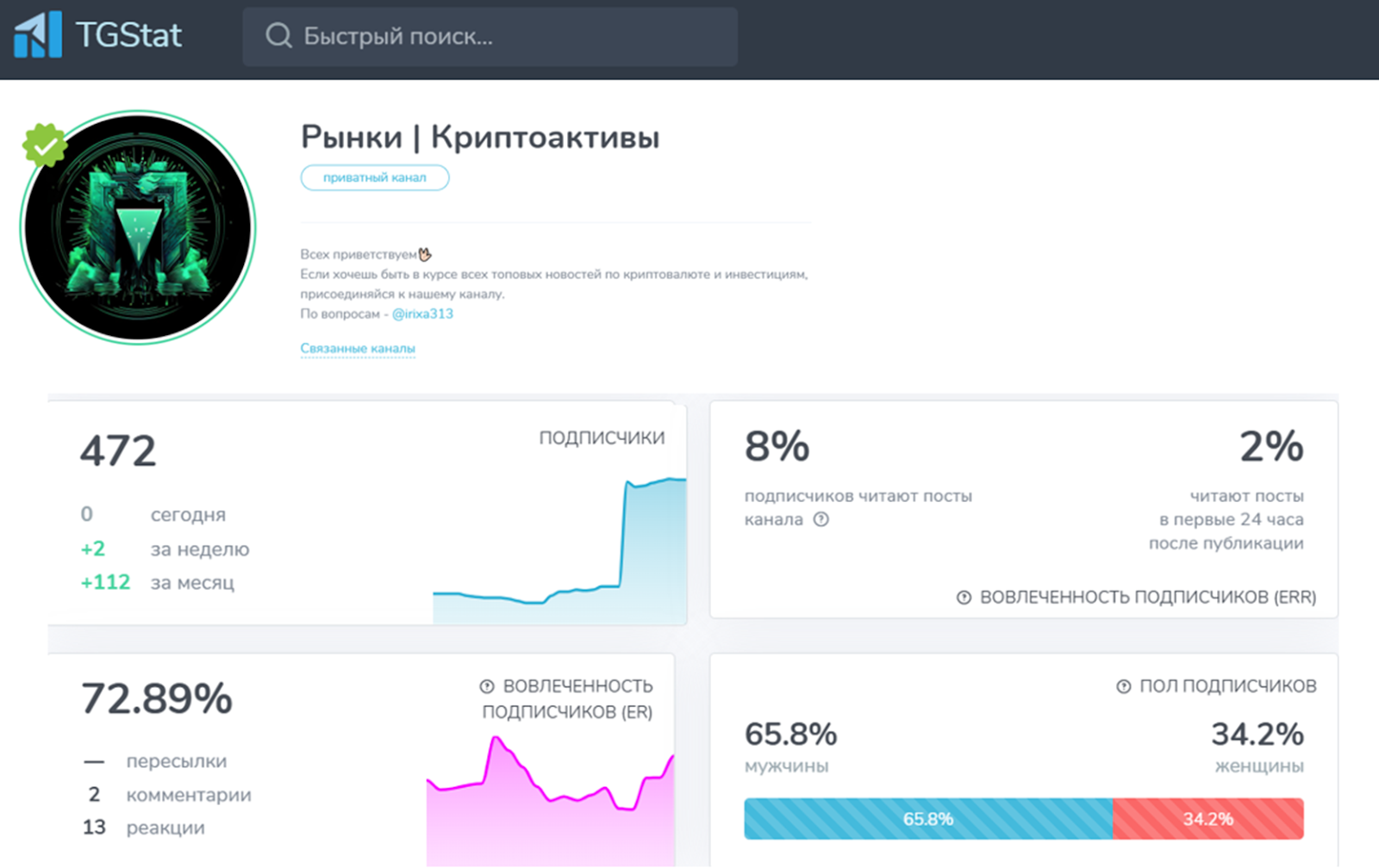 На июль 2025 г. паблик насчитывает всего 472 подписчика и это очень низкий показатель, как для крипто канала. Только 8% подписчиков читают посты. Т.е. примерно 9–10 человек из 472 действительно что-то смотрят. Однако TGStat показывает вовлеченность 72,89% и тут уже возникают вопросы.