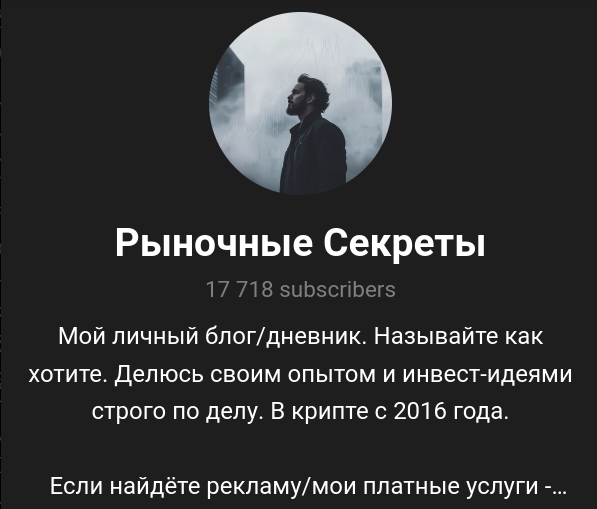 Владелец проекта считает себя профессиональном, который работает в сфере криптовалютных активов с 2016 года. Но ссылку на инвестиционный портфель не прикрепляет. Помимо этого, разработчик и идейный вдохновитель телеграмм канала «Рыночные секреты» утверждает, что в паблике он не продает платные курсы, рекламу партнерских биржи. Но мы встречали и такие утверждения, когда со временем админ отказывался от принципов.