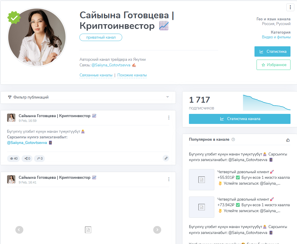 Работает Сайыына Готовцева с криптой, по крайней мере она или тот, кто использует ее внешность для ведения канала, сами так заявляют в названии. На момент сбора сведений в феврале 2026 года на ресурс подписаны около 1,7 тысяч юзеров.
