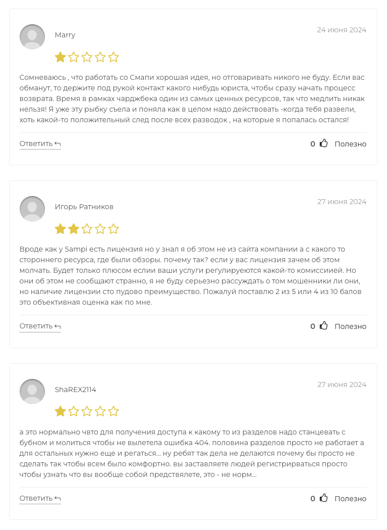 Отзывы о Sampi Online в интернете представлены немногочисленные. При этом, все они являются негативными.