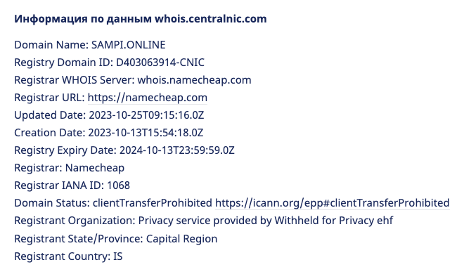 Данные сервиса Whois показывают, что доменное имя sampi online зарегистрировано в середине октября 2023-го года. Это подтверждает заявленный на сайте биржи факт, что компания работает с 2023-го года.