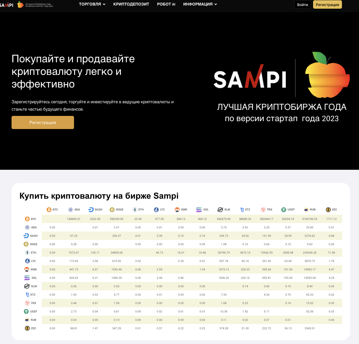 Sampi Online – криптовалютная биржа, которая начала работать в конце 2023-го года. Предоставляет основные, свойственные для таких инвестиционных платформ, возможности.