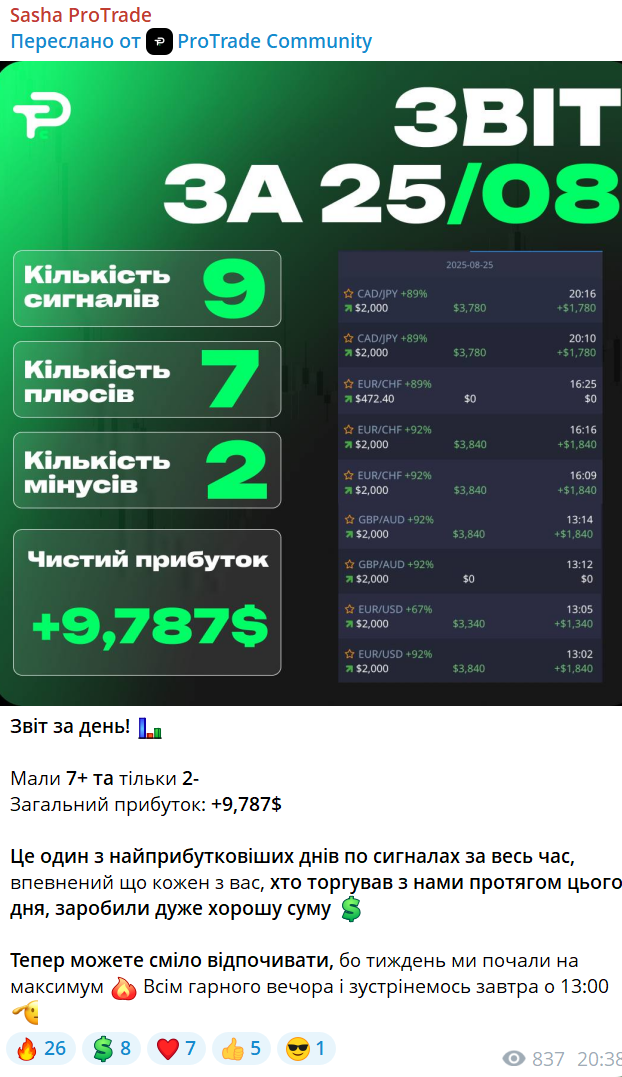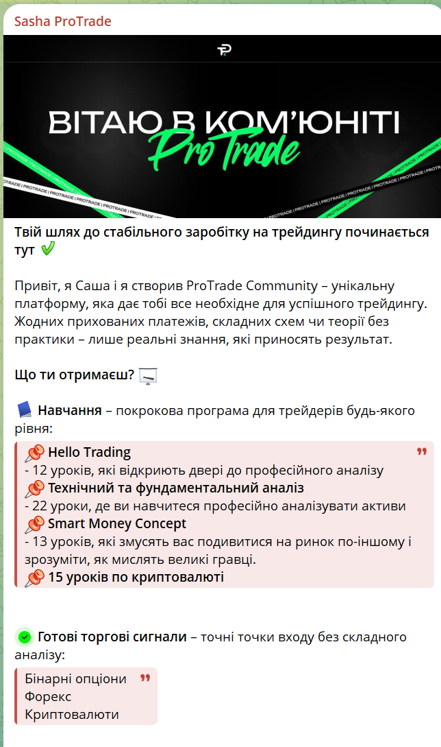 Эти курсы бесплатные и без скрытых платежей. Однако отзывы указывают, что материалы оказываются поверхностными. Уроки не дают знаний, которые необходимы для реальной торговли. Они служат, скорее, приманкой для вовлечения в другие услуги. ProTrade Community предоставляет торговые сигналы для бинарных опционов и Форекс. Они представляют рекомендации от аналитиков. Например, какие активы покупать или продавать и по какой цене. Эти сигналы подаются как инструмент для быстрого выхода на прибыль без необходимости анализа рынка. В Telegram-канале @SashaPT_CEO заявляется, что сигналы обновляются ежедневно и помогают участникам экономить время.