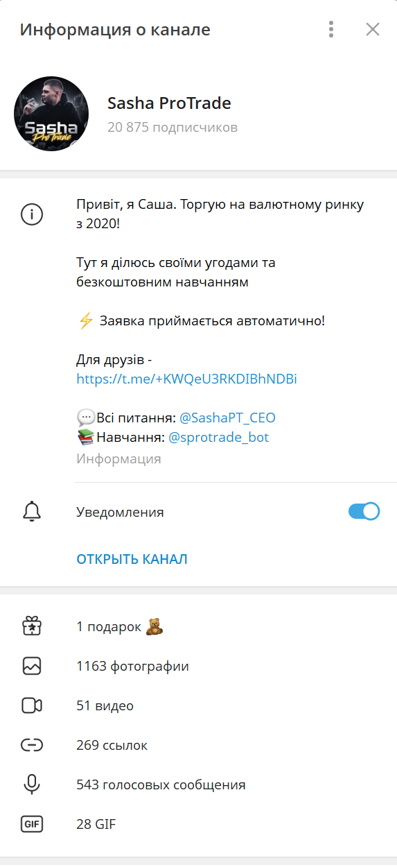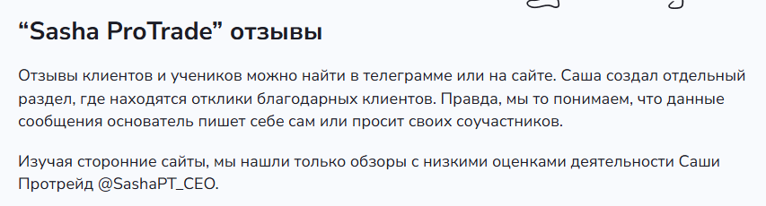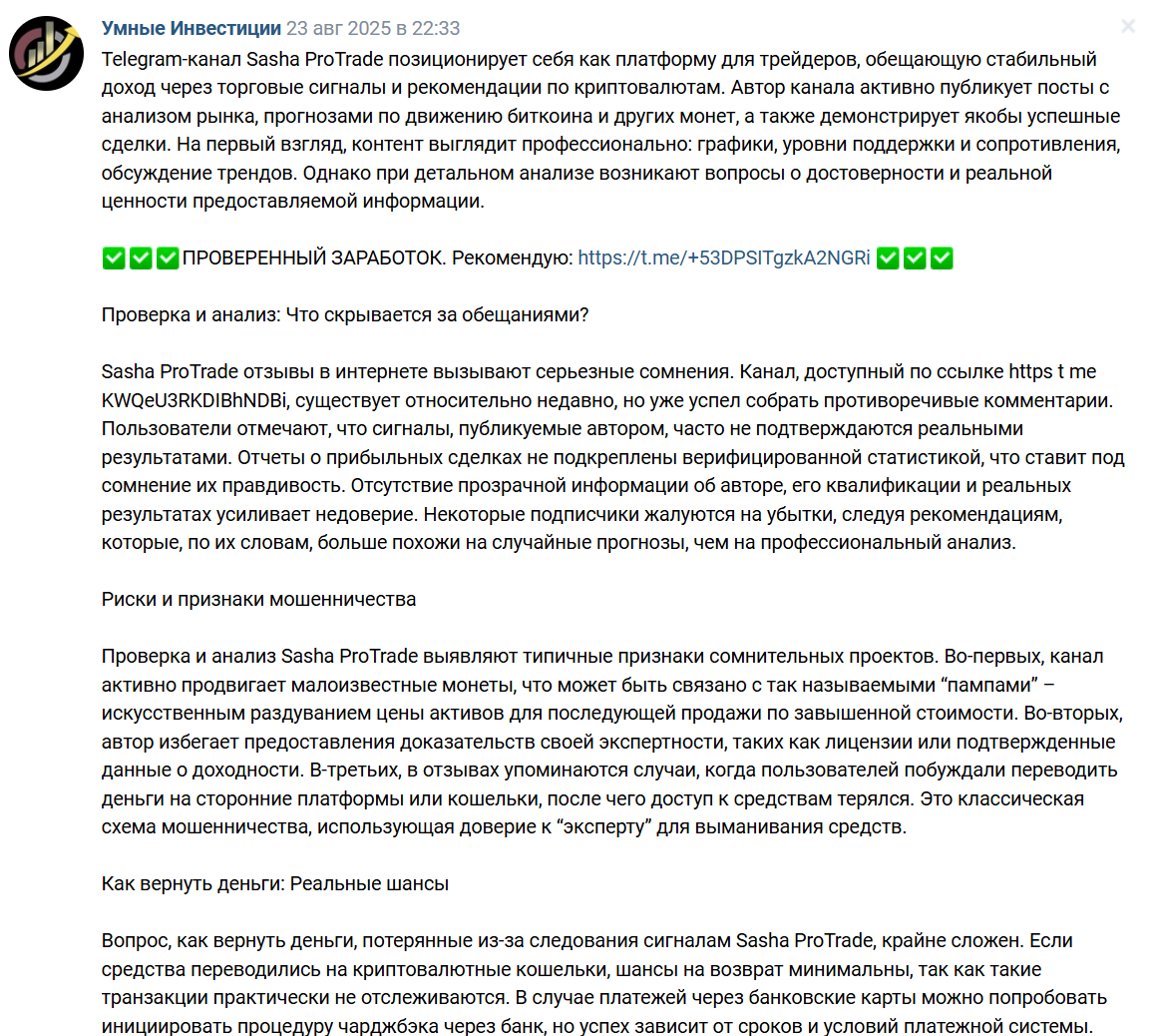 Мы не рекомендуем партнерство с каналом Sasha ProTrade и его услугами. Если у вас есть опыт взаимодействия с этим проектом, поделитесь им в комментариях.