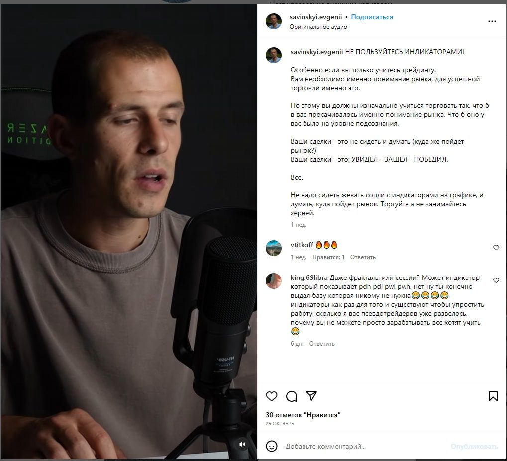 Трейдер Савинский Евгений пытается развивать личный бренд в социальных сетях: Telegram, Instagram, YouTube. Пока особых успехов на этом поприще он не достиг.