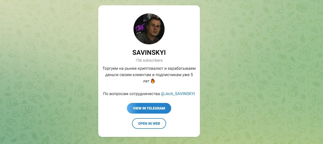 Telegram:На канал SAVINSKYI подписано всего 700 человек, учитывая низкие охваты (100-200 просмотров), живой аудитории тут ещё меньше. На этом ресурсе публикуются сигналы и отчёты по сделкам. Ранее продвигался авторский образовательный курс — ΛDVΛIN ALGORITHM, который позднее был переформатирован в закрытый клуб. С ноября 2019 года наблюдается тенденция к снижению числа подписчиков. Мы связываем это с низким уровнем доверия целевой аудитории и отсутствием полезности.