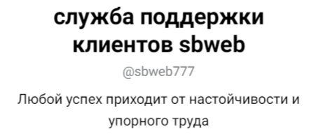 У Sbweb Customer Service имеется техническая поддержка, с которой можно связаться через контакт sbweb777. Общение осуществляется через телеграмм-канал. В нем нет никакой, даже базовой информации о работе сервиса. При входе в канал видно лишь приветствие, создается впечатление, что помощь будет оказывать бот.