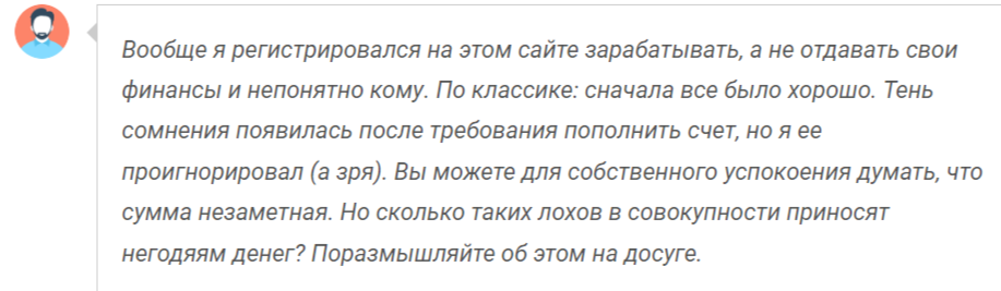 - Отрицательные отзывы. Пользователи рассказывают, как их обманули. Вкладывая деньги, вы можете остаться не только без прибыли, но и без своих средств.
