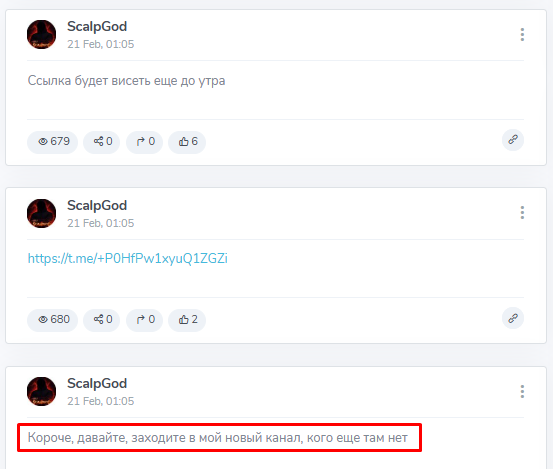 Telegram сообщество посвящено краткосрочной торговле на крипторынке. В описании проекта автор обещает “быстрый скальп и быструю обработку”. Здесь же он пытается создать иллюзию популярного наставника, сообщая, что от его имени могут писать и мошенники. На время обзора в комьюнити почти 9 тысяч подписчиков. Забегая вперед скажем, что публика является накрученной, судя по наличию откликов на сторонних ресурсах и активности аудитории на другом проекте-предшественнике.