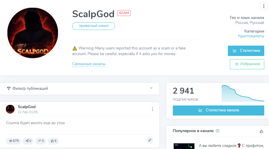 Предыдущий канал уже получил маркер “скам” и предупреждение от мессенджера о том, что на проект жаловалось много пользователей. Общая аудитория здесь составляет 2,9 тысяч подписчиков.