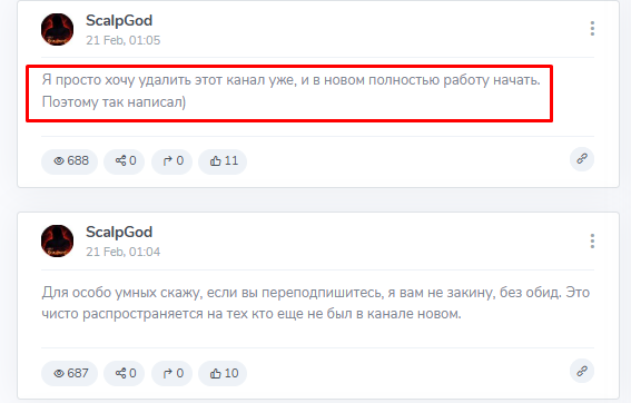 Свое желание создать новый ресурс и переместить туда активную аудиторию трейдер обосновал тем, что “просто хочет удалить этот канал”.