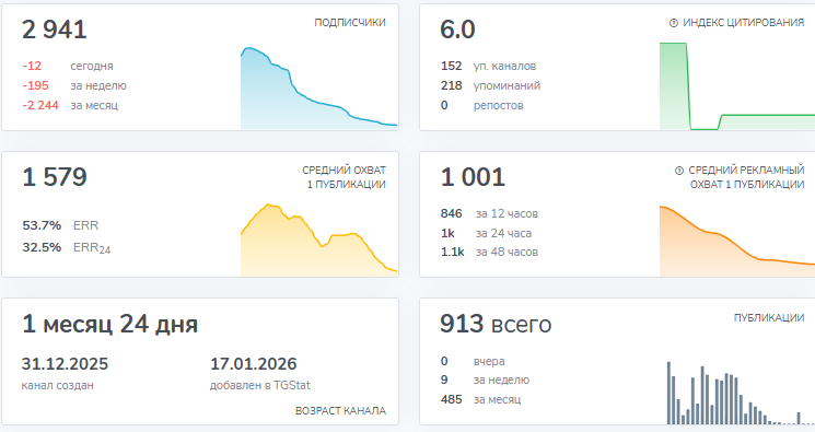 Судя по массовым отпискам от канала, номинальное количество участников было накручено ботами. Паблик автора просуществовал с конца декабря 2025 по январь 2026 и за этот короткий период уже успел соскамиться.