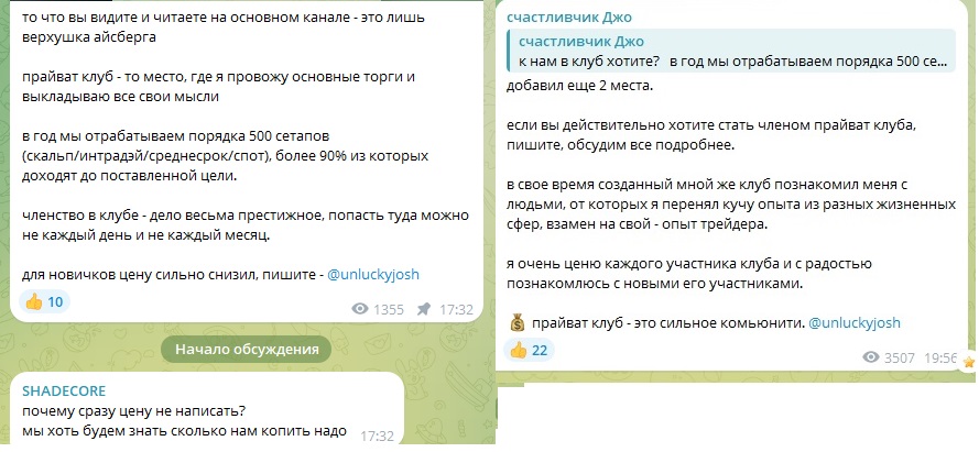 Практически ежедневно, админ размещает объявления с приглашением вступить в его закрытый клуб. Он утверждает, что сигналы, которые он размещает в Телеграмм канале Счастливчик Джо крипта, это всего лишь маленькая часть того, что получают подписчики Прайвайта.