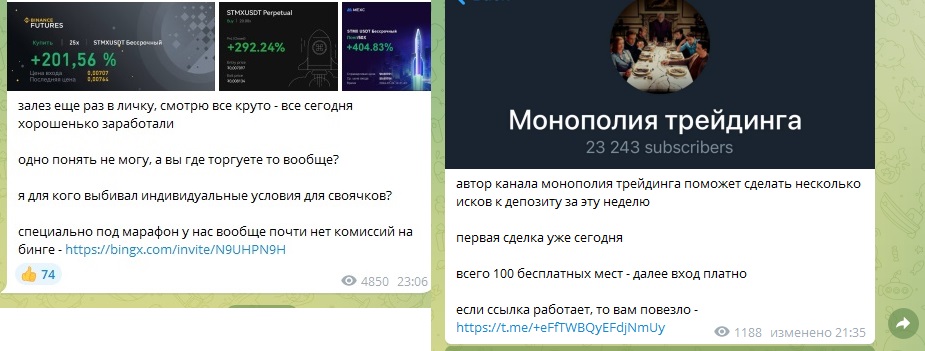 Стоит отметить, что у Джо есть и минусовые сделки, отчеты по ним он не удаляет. Подписчики могут копировать все действия админа, но есть одно важное условие: Джо работает на бирже Бингс, поэтому сигналы, с его слов, действительны только для этого ресурса. Он настоятельно рекомендует зарегистрироваться на платформе по его реферальной ссылке и только потом заключать сделки методом копитрейда.