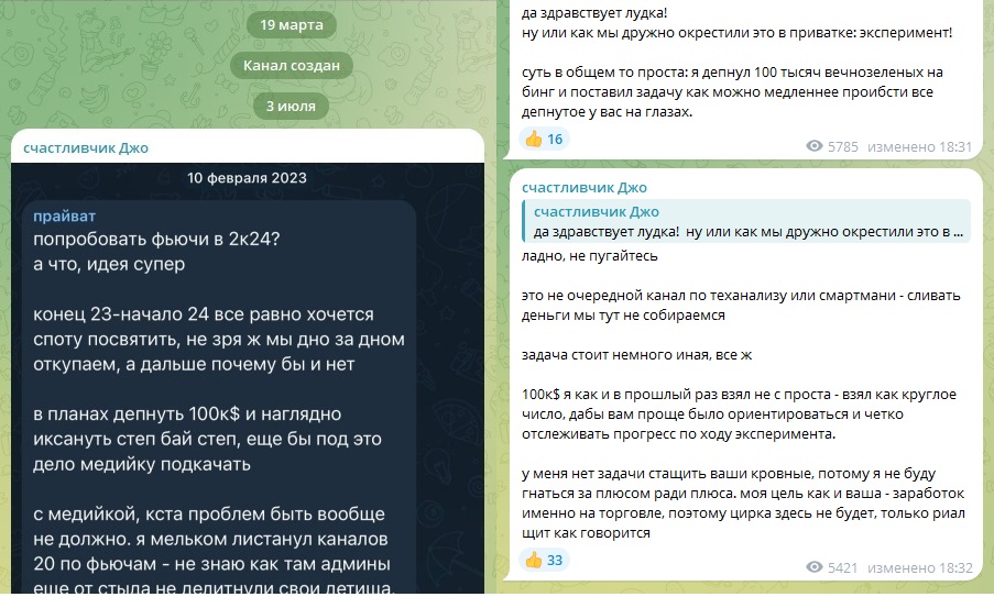 Телеграм канал Счастливчик Джо запущен 19.03.2024, но активность проявил с 03.07.2024. Его владелец работает под противоположным ником Unluckyjosh (Несчастливый Джош), он опытный трейдер на криптовалютном рынке, ведет приватный канал Прайват, где выдает готовые сигналы с их подробным анализом и разборкой. Новый паблик создан специально для проведения публичного марафона-эксперимента по раскрутке депозита на фьючерсах со 100 тыс. “вечнозеленых” до 200 тыс.