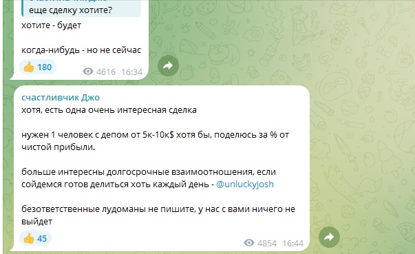 Кроме продвижения биржи, Джо часто размещает рекламу других ресурсов, публикации “с дожимом” (только сегодня, ссылка действует несколько часов, места ограничены и т.д.).Периодически в ленте канала появляются публикации с предложениями заработать на “очень интересной” сделке, на которую админ берет всего одного человека с депом 5-10К долларов. Личный интерес — проценты от прибыли.