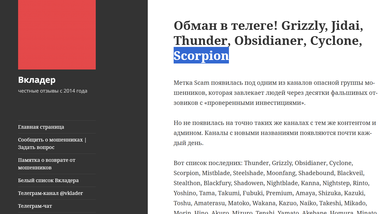 На 8 января 2026 г. канал Scorpion тг уже не существует, как и личный аккаунт трейдера, через который ранее велось общение с подписчиками и потенциальными клиентами.