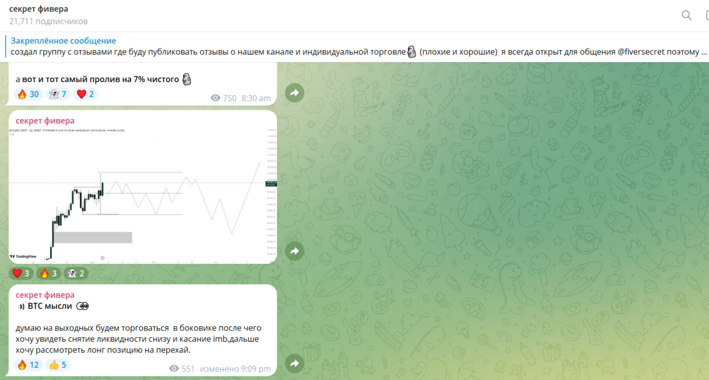 Контент представляет собой новостные публикации, сигналы и прогнозы. Где-то автор прямым текстом призывает подписчиков делать ставку на конкретную валюту. Оценить результативность прогнозов невозможно. Fiversecret не публикует конкретную статистику своих операций, которую можно было бы проверить.