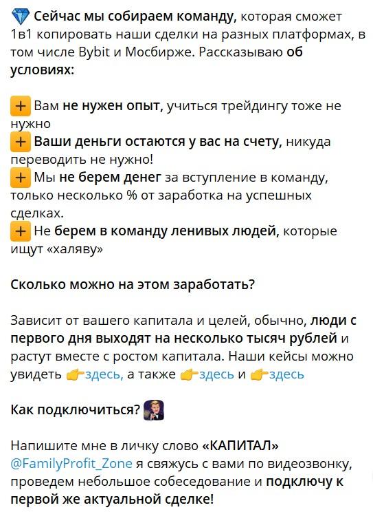 Андрей периодически набирает людей в свой приват-клуб для совместной торговли. Говорит, что совершать сделки можно на разных площадках, включая «Байбит» и Московскую биржу. Берет за сотрудничество 10% от дохода клиента. Для участия нужно написать ему в личные сообщения в Телеграме – familyprofit zone.