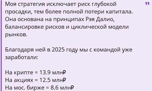 Используя ее, команда трейдеров Андрея заработала за 2025 год на криптовалютах 13 900 000 рублей, акциях – 12 500 000, Московской бирже – 8 600 000. Свыше 150 клиентов автора проекта стали миллионерами, еще столько же уверенно идут к этой цели. Но реальных доказательств всех этих слов нет. Верифицированная отчетность не представлена.