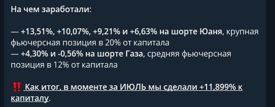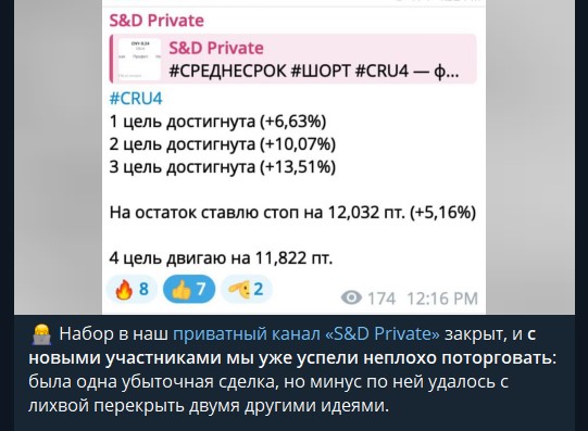 На канале заявляют об огромной доходности: каждый месяц его владелец вместе с участниками приватного сообщества якобы зарабатывает около 10% к капиталу, что много для российских ценных бумаг. Подтвердить такие цифры ничем не может: отчеты из VIP-канала выходят в формате текстовых постов, вписывать в которые можно что угодно. Ссылки на ресурсы вроде Пульса, которые отслеживают прибыльность сделок инвесторов, не дают.