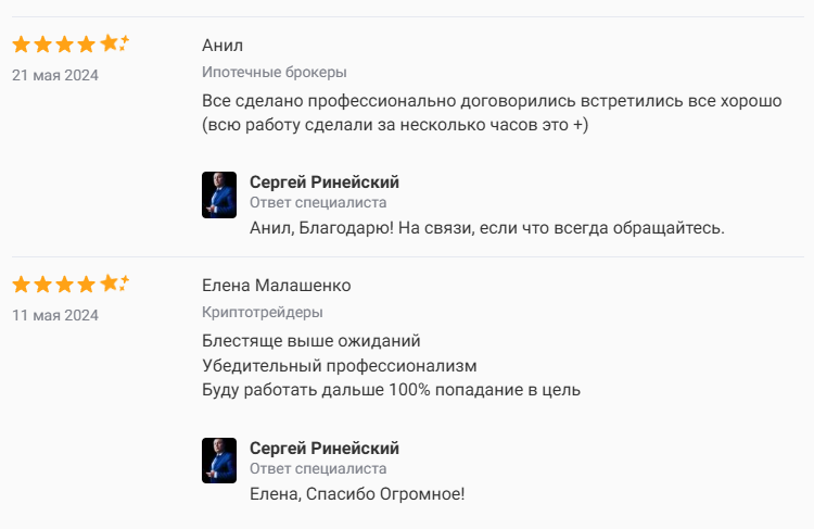 Отзывы о трейдере Сергее Ринейском в интернете кажутся довольно странными. Есть определенные сайты-отзовики, где рейтинг инвестора абсолютно идеален. При более 50 оценок никто даже не поставил 4 звезды. При этом положительные комментарии выглядят не очень убедительно: они короткие, не содержат никаких конкретных данных, лишь что-то вроде “все прошло отлично”, “100% попадание в цель” и т.д.