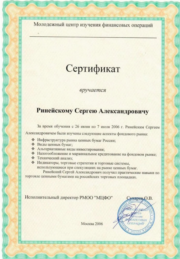 Для подтверждения своей квалификации по трейдинг-обучению Сергей Ринейский даже прикрепляет свои лицензии и сертификаты. Один из них выдан некой РМОО “МЦФО”. Это частная организация по изучению финансовых операций, поэтому его значимость находится под большим вопросом. К тому же она не легализует обучающую деятельность Сергея, а лишь подтверждает, что он имеет какие-то финансовые навыки.