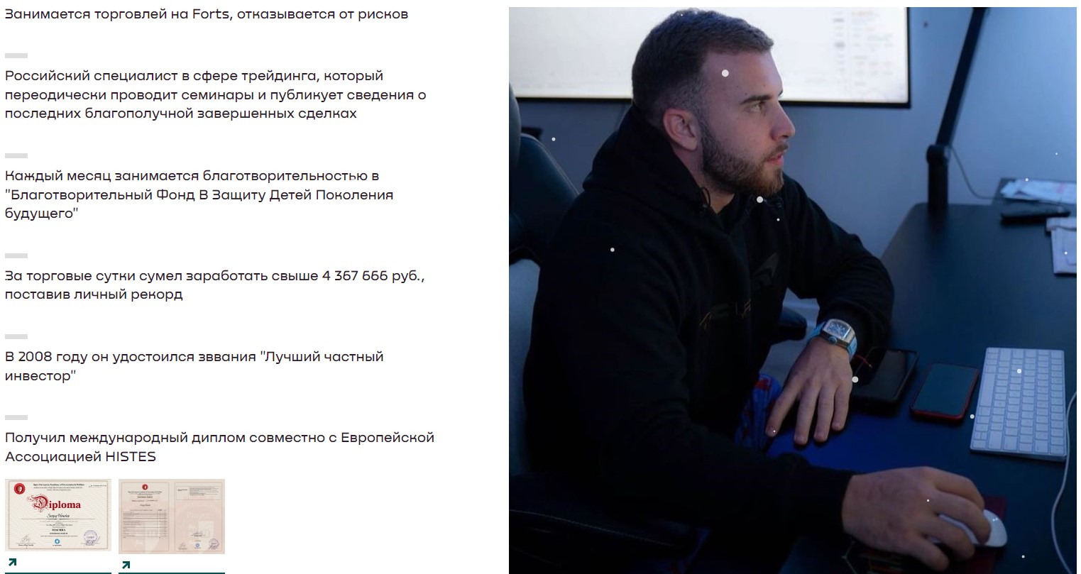 Трейдер появился в социальных сетях летом 2024 года, утверждает, что давно торгует на бирже, имеет профильное западное образование и делает стабильную прибыль. Подтверждения его опыта или навыков не найдены.