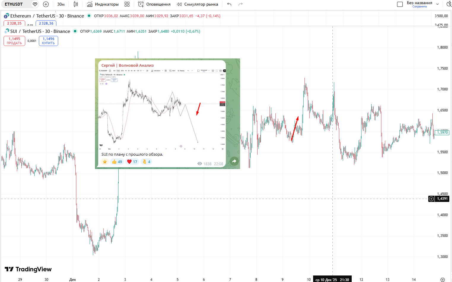 Для проверки мы взяли торговые сигналы, опубликованные 8 декабря. В посте с информацией по криптовалютной паре SUI/USDT автор утверждал, что к 10 декабря стоимость монеты SUI упадет, однако проверка показала, что ее цена выросла. Второй сигнал касался пары ETH/USDT. Здесь трейдер тоже ошибся с прогнозом. Следуя рекомендациям Сергея, читатели рисковали потерять свои деньги.