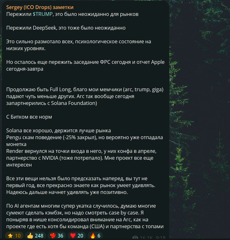 Плюс к этому, Сергей рассказывает, в какие проекты он инвестирует. Иногда в ленте можно встретить монеты, которые автор покупает и продает на бирже.