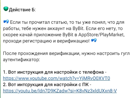 Для начала сотрудничества пользователь должен зарегистрироваться на бирже и пройти верификацию, далее написать “Арбитраж” в личные сообщения автору канала. Также в инструкции указано, что клиент может зарегистрироваться на любой бирже (якобы автор не склоняет к какой-то конкретной площадке), однако далее по тексту сообщения в ТГ видим, что делается акцент на платформе Bybit.