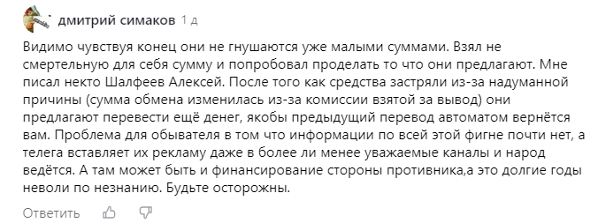 Мнения на сторонних ресурсах о проекте Арбитраж крипты RU негативные – пользователи отмечают, что команда неизвестных лиц рекламирует мошеннические обменники. В процессе сотрудничества юзерам заявляют, что отправленная сумма якобы заморожена и нужно вложиться ещё – вариантов причин может быть много (например, не прошли проверку AML), всё сводится к выманиванию максимально возможной суммы и блокировке аккаунта обманутого новоиспечённого арбитражника.