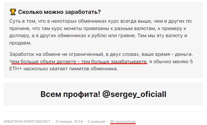 Стоимость подписки на софт не озвучивается – такую информацию сообщают только в личные сообщения. Также отметим, что во всех текстах мелькает призыв вкладывать больше для более быстрого получения внушительного профита. Инструкции созданы в ноябре-декабре 2024 года, трейдер сообщает, что у его команды уже более тысячи клиентов, но вот неувязка – важный гайд по поэтапному процессу работы не просмотрело и 100 пользователей.Отзывы о канале Арбитраж Крипты RU