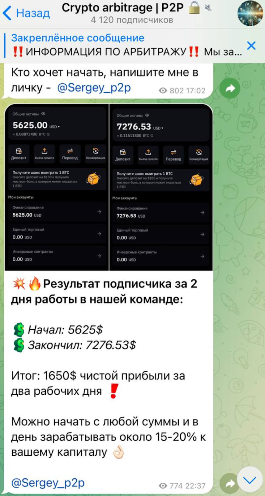 Crypto Arbitrage начал свою историю в конце 2023 года. Этот человек обещает научить людей зарабатывать, используя p2p-арбитраж. Автор утверждает, что он настоящий профи, который готов делиться секретами успешной торговли. Он уверяет, что с его стратегиями доход может быть довольно высоким.
