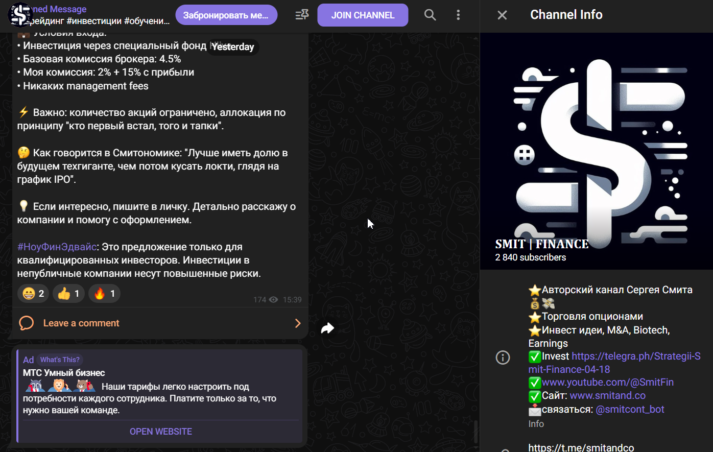Телеграмм-канал Smitandco был зарегистрирован 30 декабря 2019 года. Автор не оставляет приветственного сообщения. Публикации начинаются с рекламы стороннего ресурса и резюме по последним новостям финансового рынка. За все время существования проекта Smit finance число достигло почти 3000. Комментарии и быстрые реакции оставлять к постам можно. Но этой возможностью подписчики пользуются довольно редко. Охваты просмотров не превышают 200, что резко противоречит открытой статистике. Есть основания полагать, что админ smitcont bot использовал накрутку.