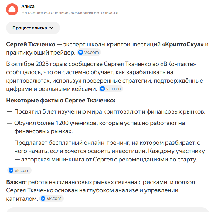 Складывается впечатление, что Сергей Ткаченко, «Эксперт школы криптоинвестиций «КриптоСкул» – вымышленный персонаж, который на самом деле не проводит платное или бесплатное обучение, стоимость которого не разглашается. Скорее всего, через свой вебинар он продвигал сомнительные платформы, сделки на которых якобы помогали зарабатывать, а на самом деле приводили к убыткам.
